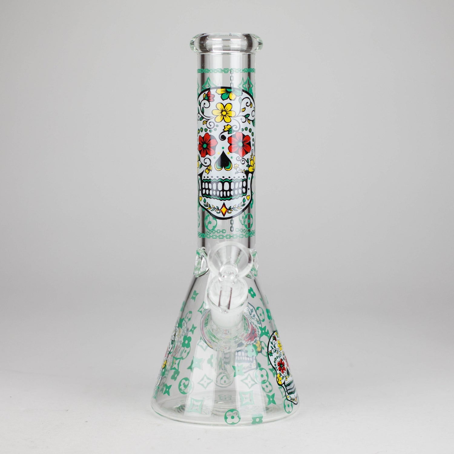 Add some personality to your setup with this 10" Sugar Skull Glass Beaker Bong. Featuring bold, colorful sugar skull artwork, this piece is perfect for anyone who loves unique, eye-catching designs.