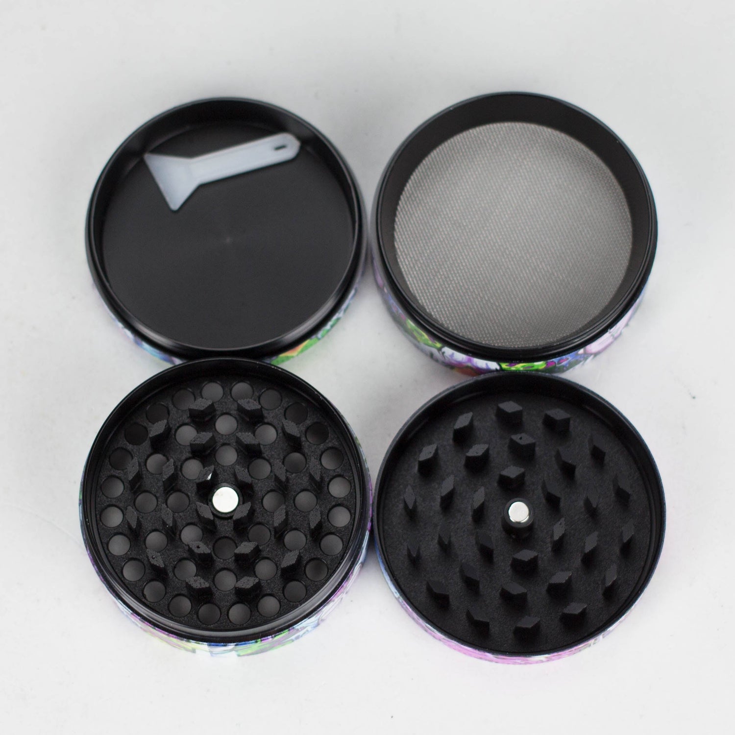 - Stainless steel micro-screen for kief filtering; kief scraper included