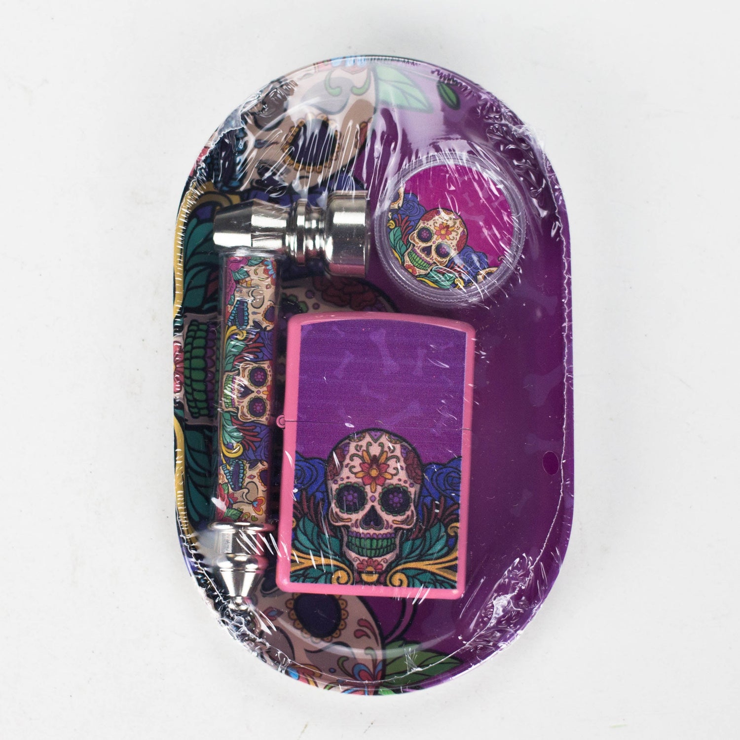 Metal Pipe & Lighter Gift Set – Includes Zippo-Style Lighter, Grinder & Tray - Sugar Skull is backordered and will ship as soon as it is back in stock.