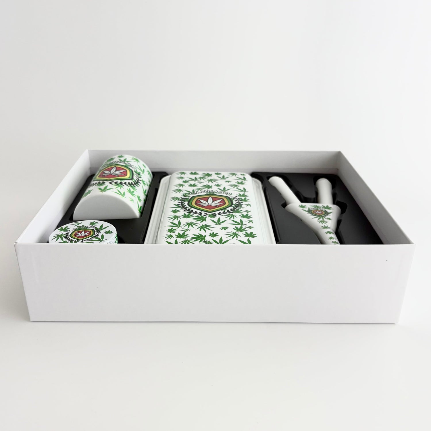 For the connoisseurs of calm and the lovers of all things natural, our Leaf Smoking Accessory Gift Set brings clean style and cannabis pride to your smoke sessions. Drenched in lush green tones and bold plant iconography, it’s the perfect gift for the laid-back yet elevated smoker.