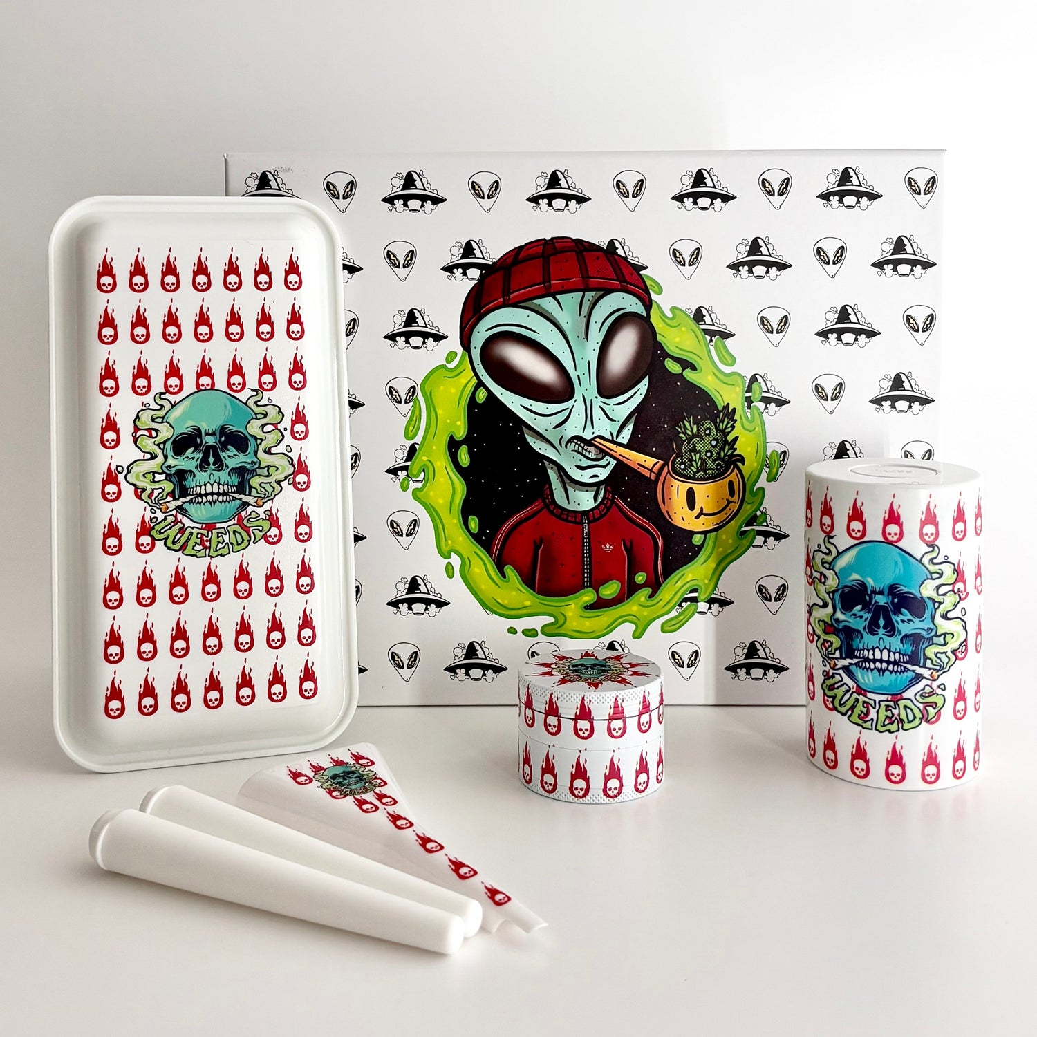 Unbox a galaxy of good vibes with this bold and badass Skull Smoking Accessory Gift Set. Featuring a one-of-a-kind cosmic design with trippy alien and skull graphics, this set is perfect for stoners who like their smoke sessions with a side of style.