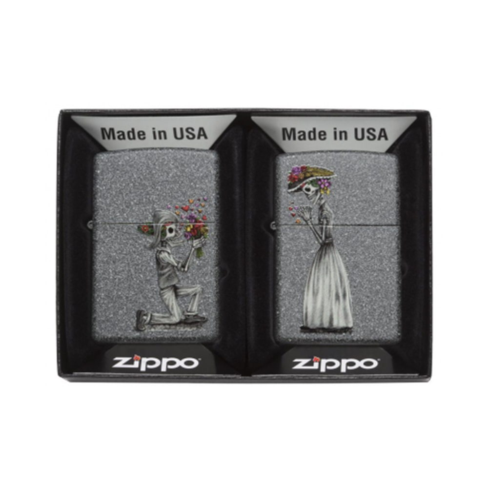 Death cannot stop true love. This set of two Iron Stone windproof lighter captures a romantic tale of love. Comes packaged in a gift box. For optimal performance, fill with Zippo lighter fuel.