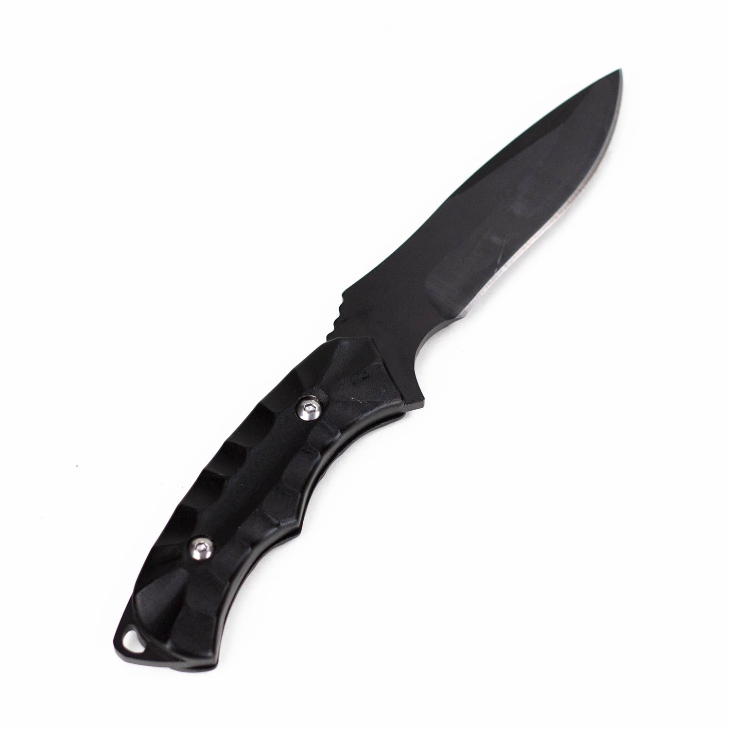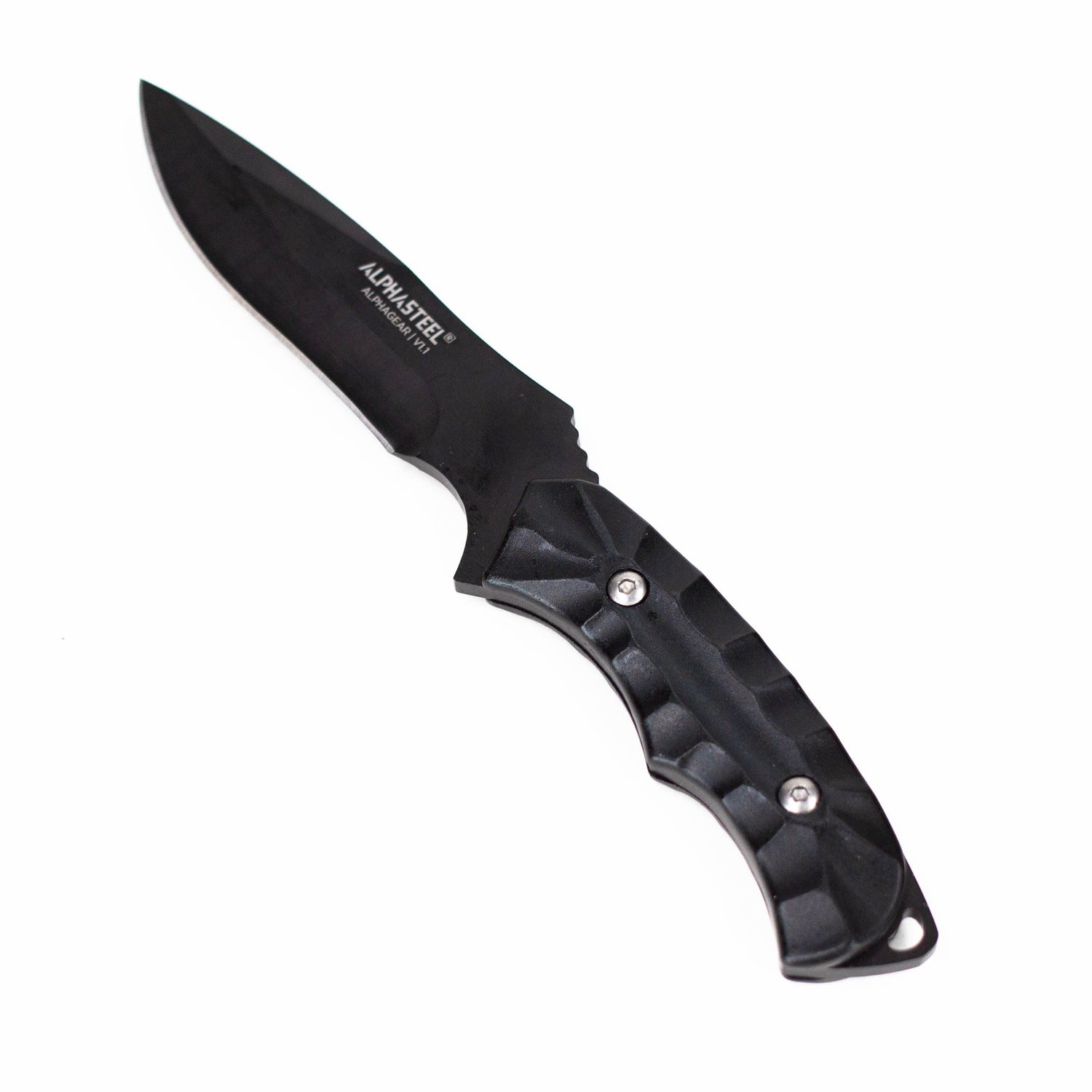 The ALPHASTEEL 9" Full Tang Fixed Blade Hunting Knife is particularly sharp and well-suited for outdoor use. It also features a solid steel hand guard and comes with a free, durable black nylon webbing sheath with a belt loop and snap closure.