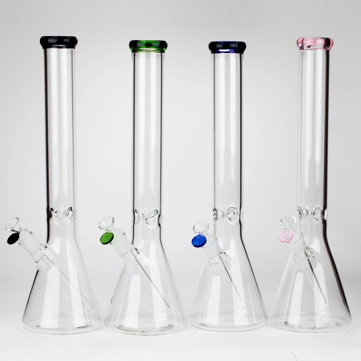 This classic beaker comes with ice notches and has a diffuser downstem and herb bowl. The rimmed mouthpiece is in coloured glass, giving it a strong contrast. This beaker is the perfect base for adding your preferred accessories to personalize it. A 12-inch version is also available