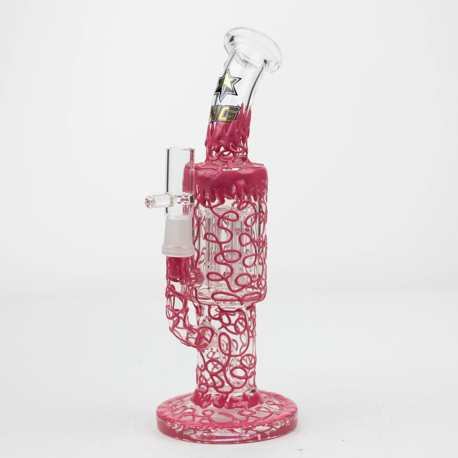 This highly stylized Nice Glass rig has a 6-arm tree percolator that filters the smoke a second time providing more diffusion to your hit. The re-enforced stem holds a reverse female bowl with roll stopper. Coloured artwork adorning the entire body of this rig replicates continuous liquid metal drippings.