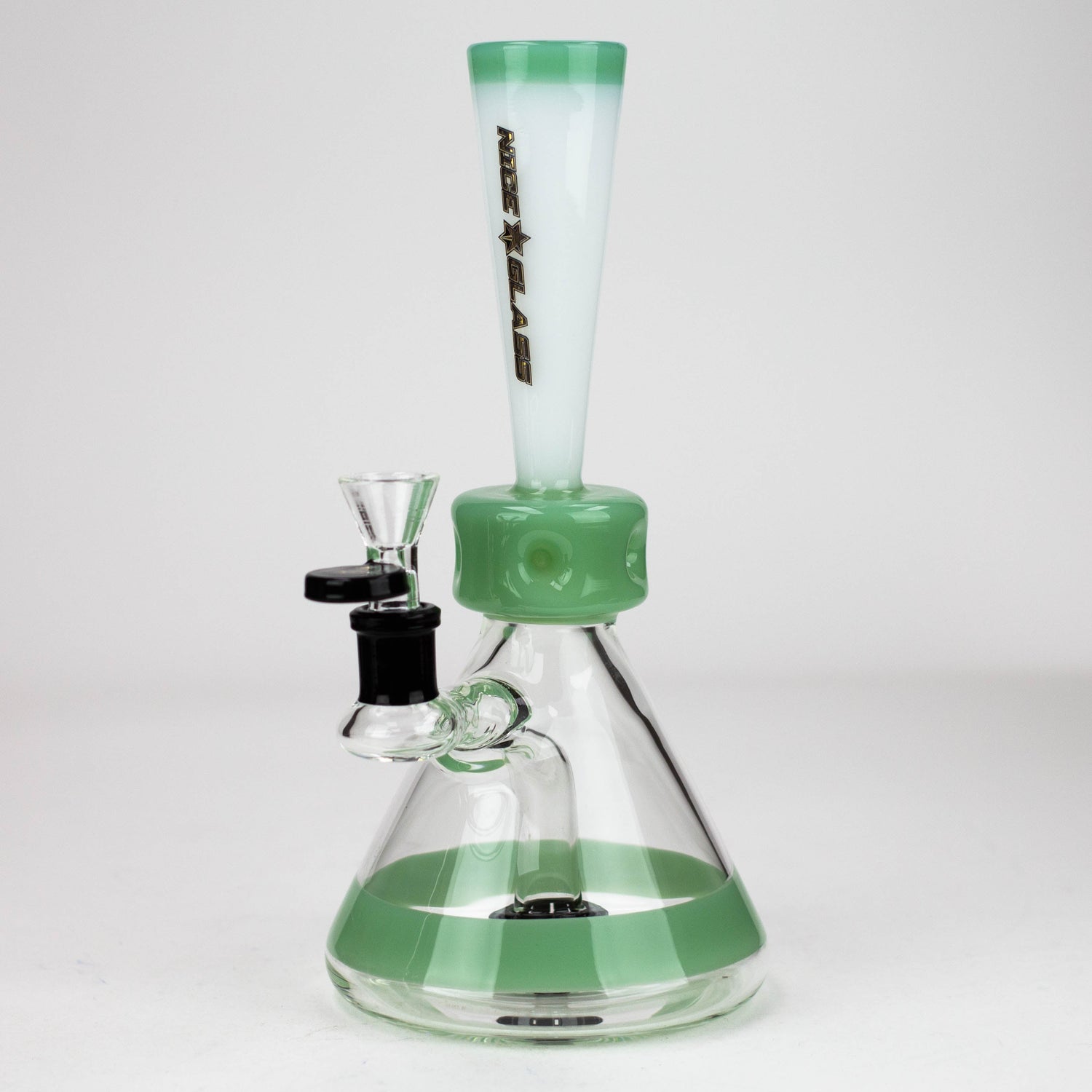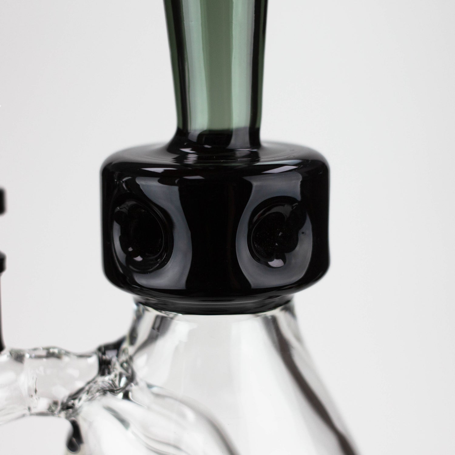 This stemless bubbler shares the same base style as a beaker bong, but that is where the similarity ends. For starters, the mid-section housing ice notches and a neck that graduates in width to a seamless mouthpiece give it a little flare in style. It is equipped with a showerhead percolator and a wide downstem that works well even with the lowest of water lines. Accent colours adorn the bubbler on unique parts.