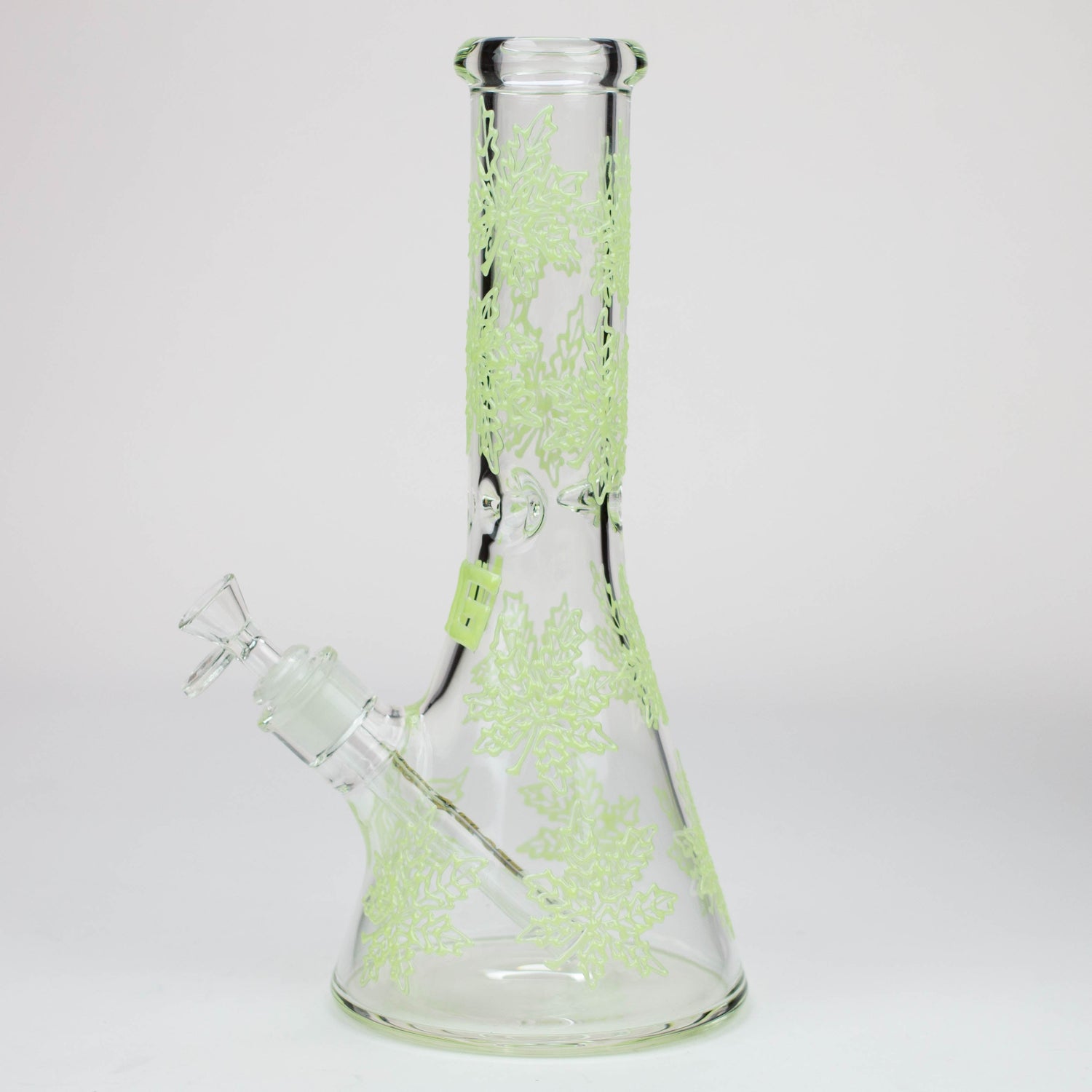 This 7mm thick clear glass beaker bong features glow-in-the-dark cannabis leaves from top to base. It's a strong and hefty piece that's pretty difficult to knock over. Perfect for those with clumsy friends. It comes with a diffuser downstem, herb bowll and ice notches.