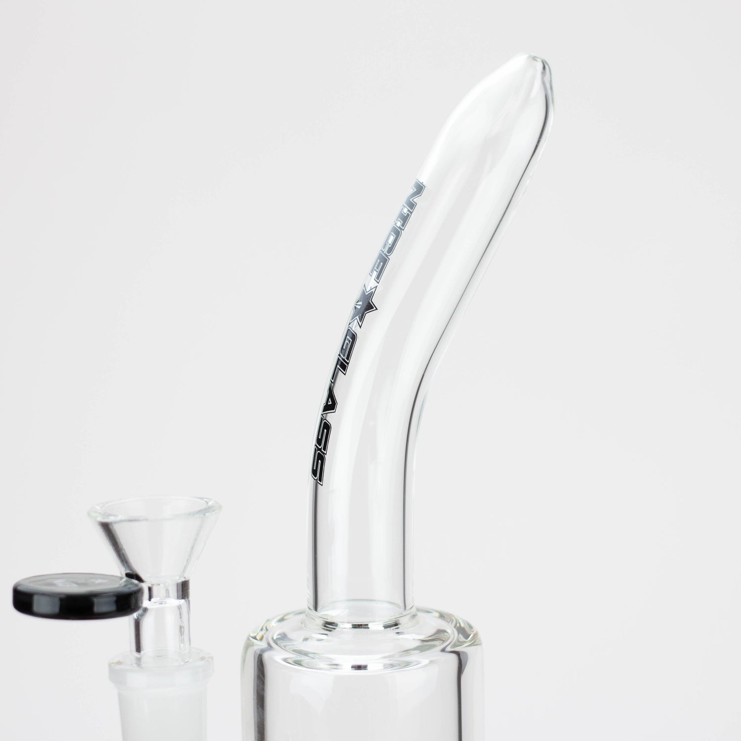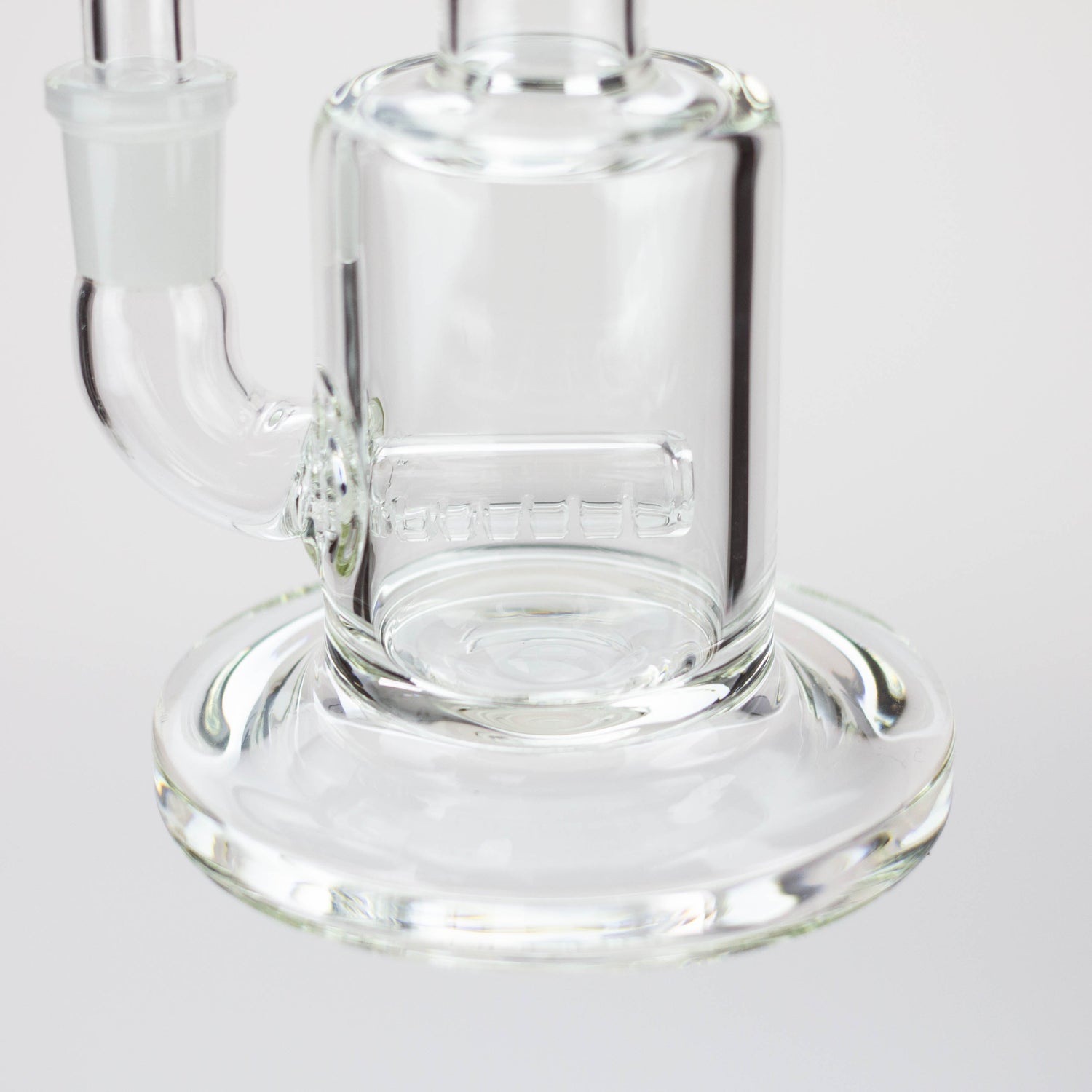 A small inline percolator bubbler with a long bent neck that features a flat mouthpiece. Comes equipped with flower bowl.