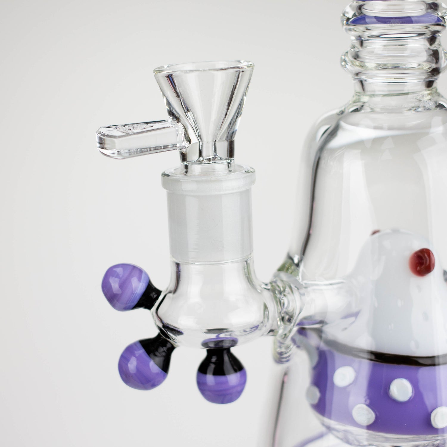 Cute and sophisticated. This large piggy bubbler is not just a deco piece, but it packs a great punch as well. The piggy percolator consists of 6 evenly spaced air holes on the bottom side that feeds the vapour into the bell-shaped chamber. Glass dots, solid orb, and baubles, all add to the whimsical character.