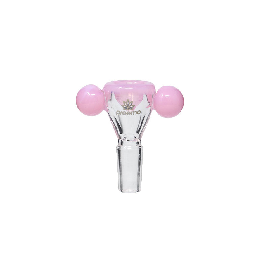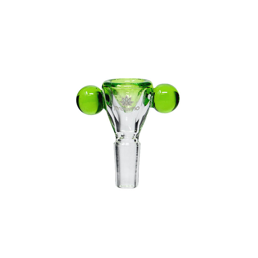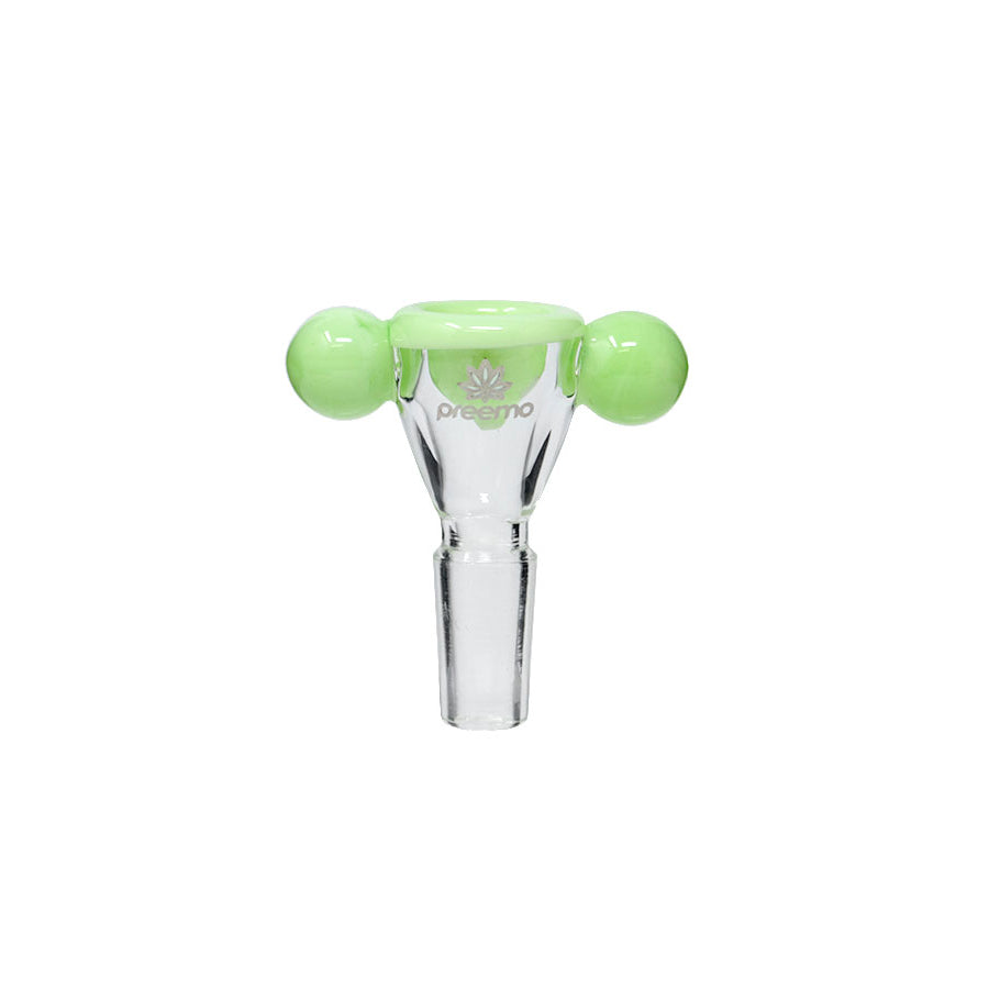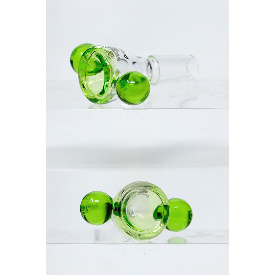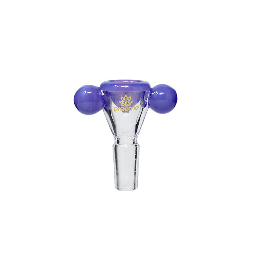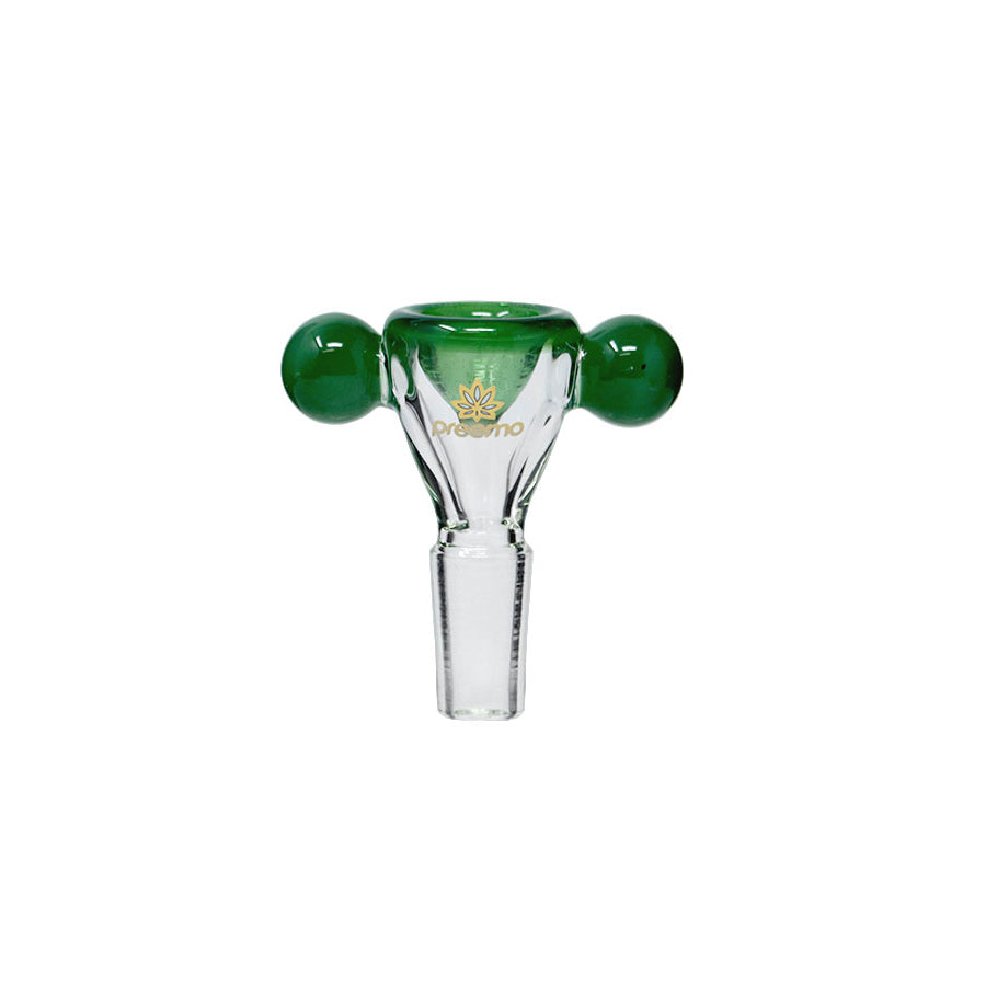 This bowl features two baubles for easy handling, keeping your hands away from the heat. The outer glass is all clear, including the joint, allowing the inside bowl color to show through. It comes in beautiful colors that easily match your Preemo bongs.