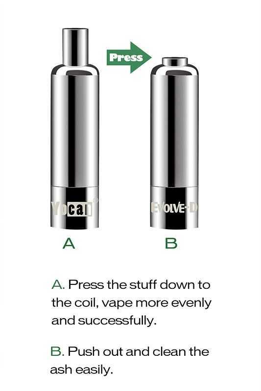 The Evolve-D is a very portable dry herb pen with a spring-loaded mouthpiece. Simply push the mouthpiece down to press your material against the coil, or clean ash from the unit.