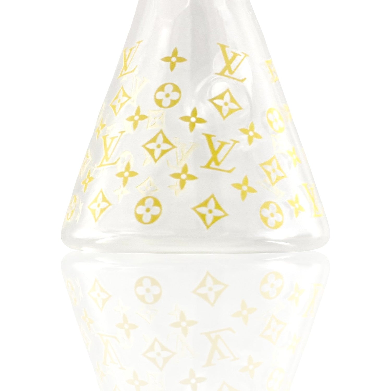 - Frosted monogram-style patterns on the beaker base