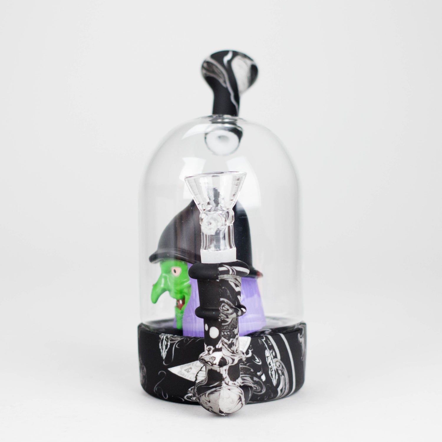- Design: Bold witch character centerpiece under a clear glass dome