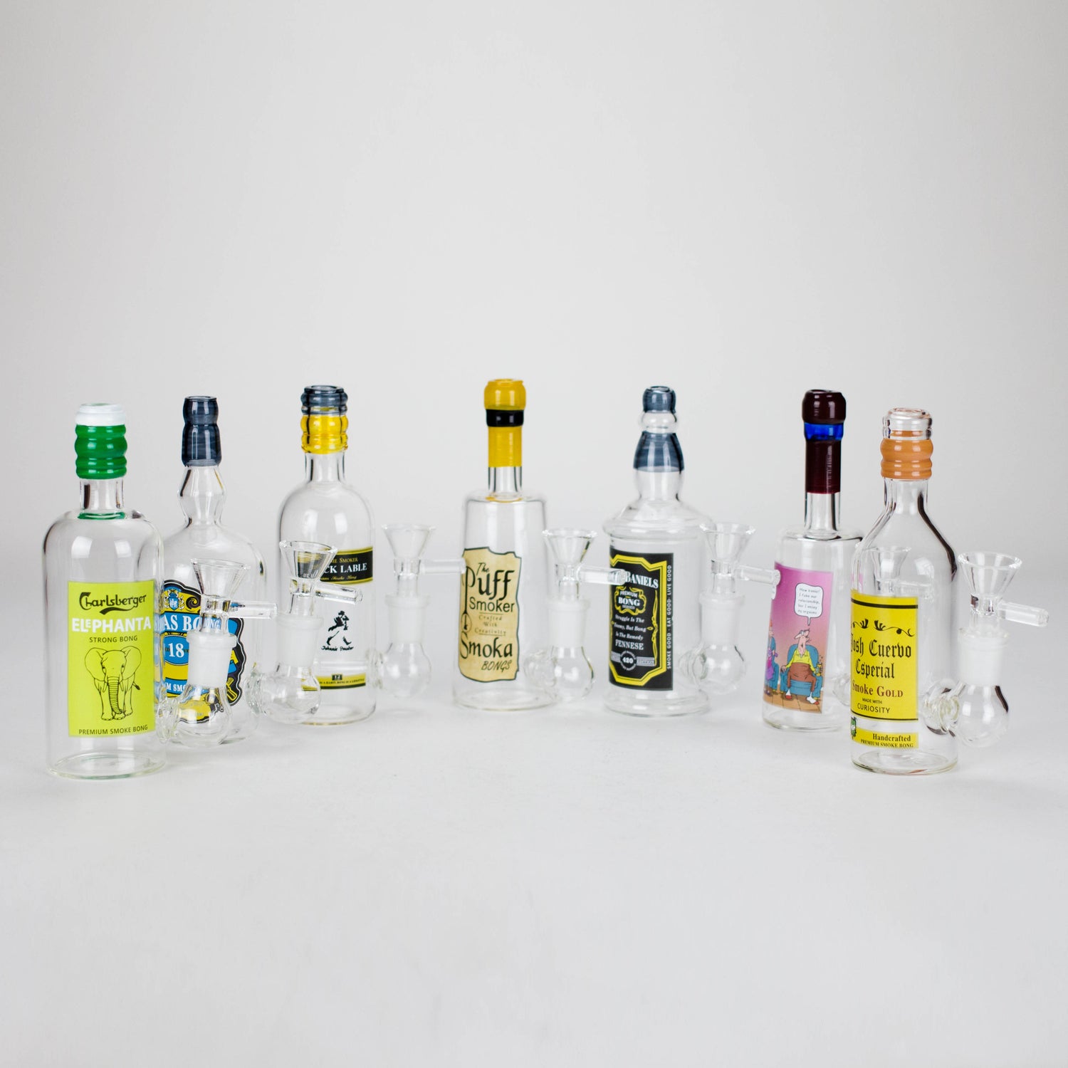 Add a playful twist to your smoking sessions with the Liquor Bottle Glass Bong, a uniquely crafted piece that parodies popular alcohol brands. Handcrafted from durable 5mm thick glass, this 6-inch bong combines functionality with novelty appeal, making it an ideal choice for collectors and enthusiasts seeking a conversation starter.