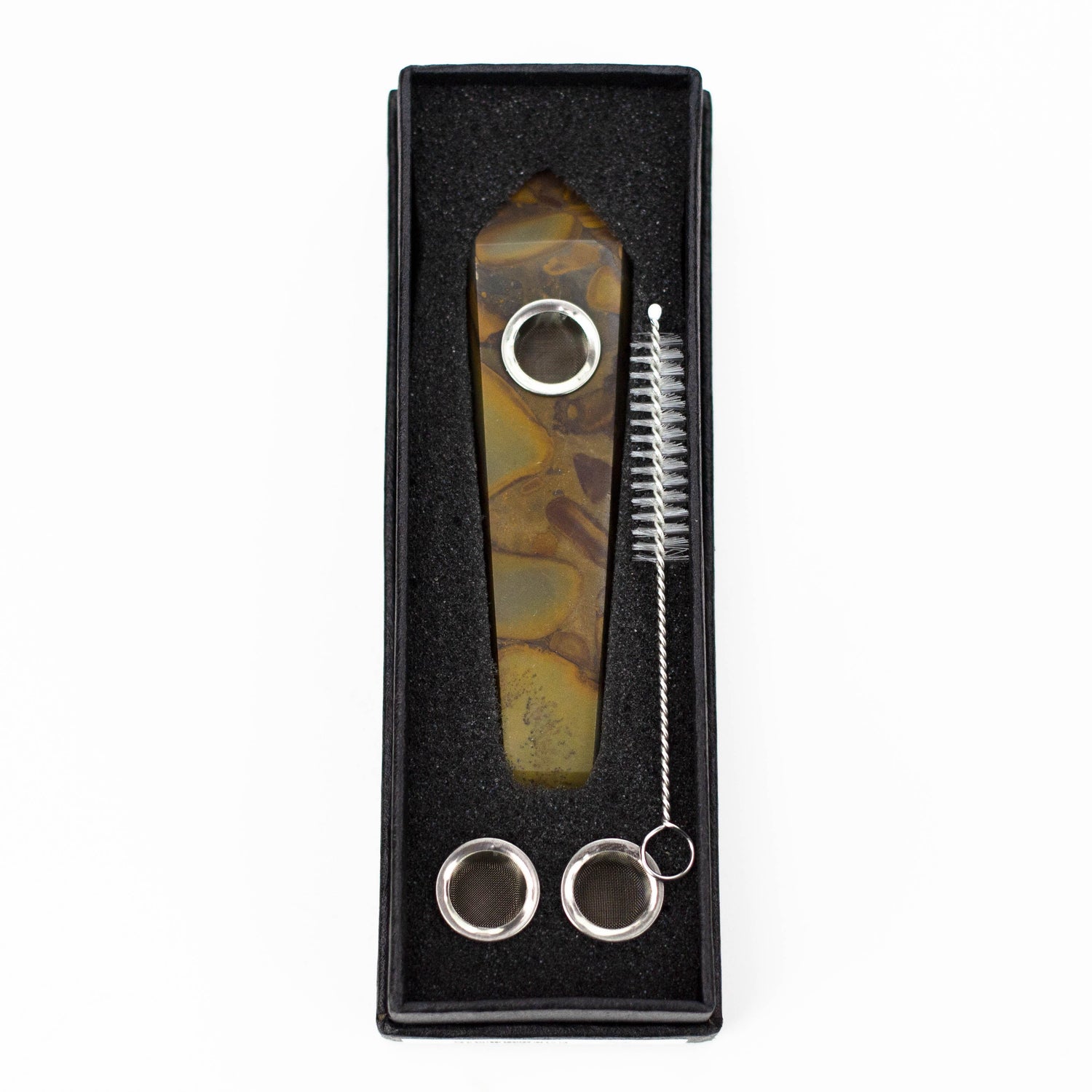 Marvel at the stunning Apophyllite Stone Crystal Pipe with Choke! This gleaming piece is crafted from extraordinary semi-precious material, making it easy to maintain and clean. Just like quartz pipes, it's equipped with a carb hole and filter for that classic glass pipe look and feel.