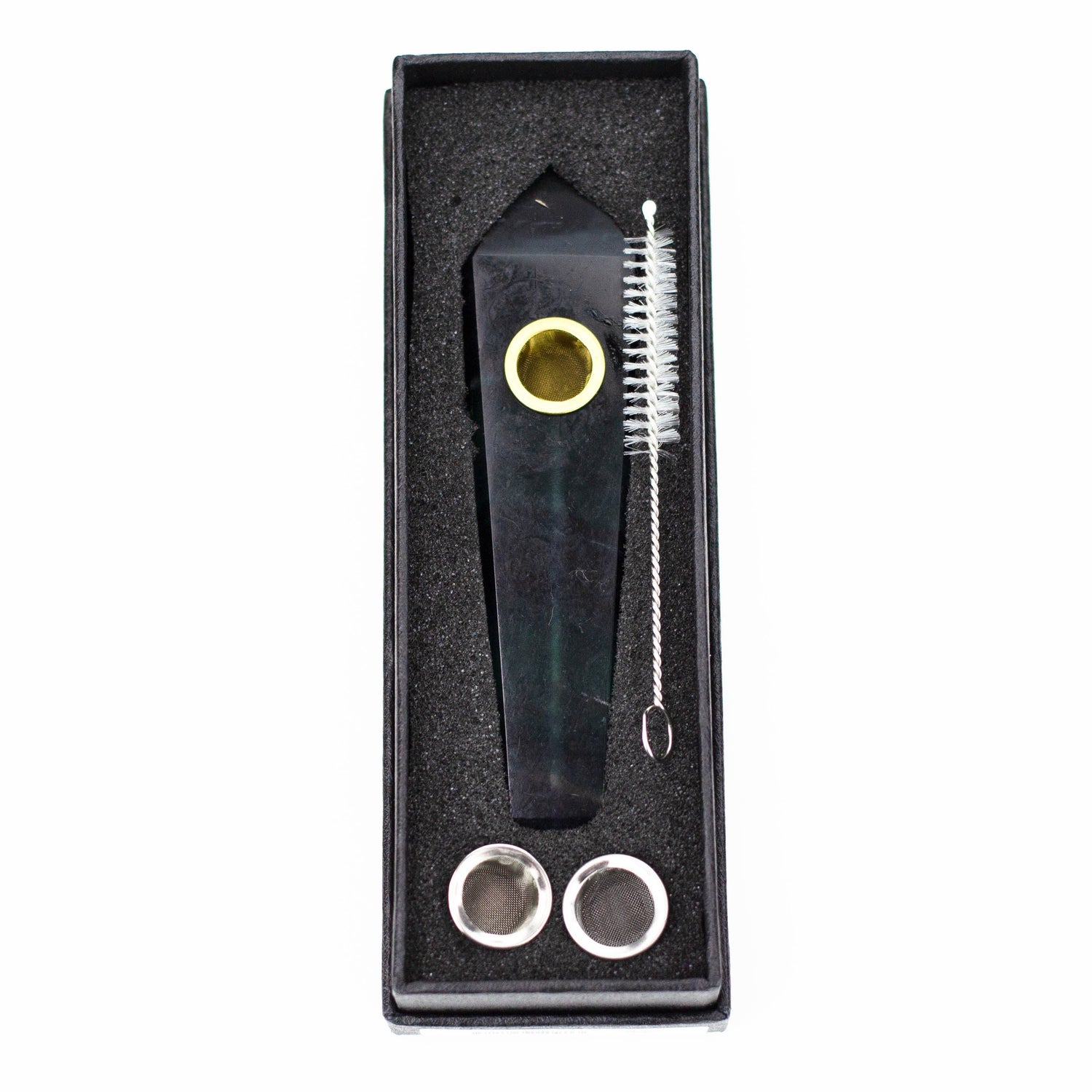 Marvel at the splendiferous Rainbow Fluorite Crystal Pipe with Choke! This exquisite, semi-precious piece boasts ease of maintenance and is in top-notch condition. With its choke and filter, it provides a classical glass smoking experience. Dimensions: 4.25" x 1".