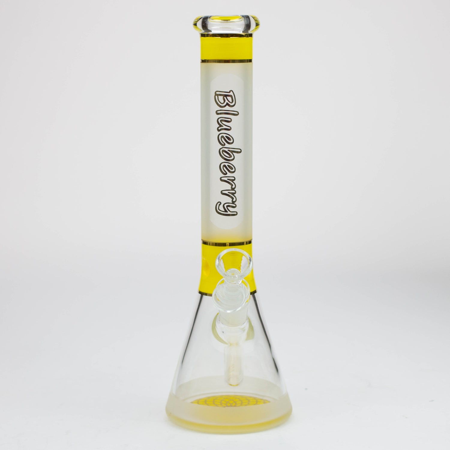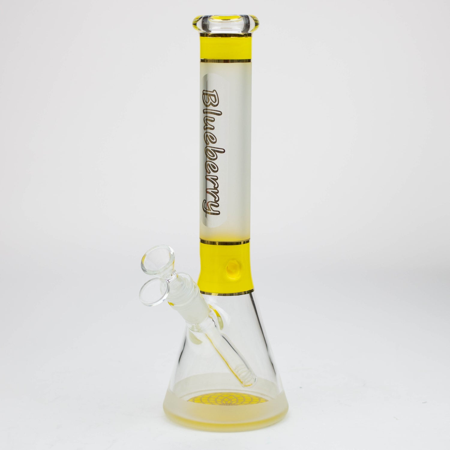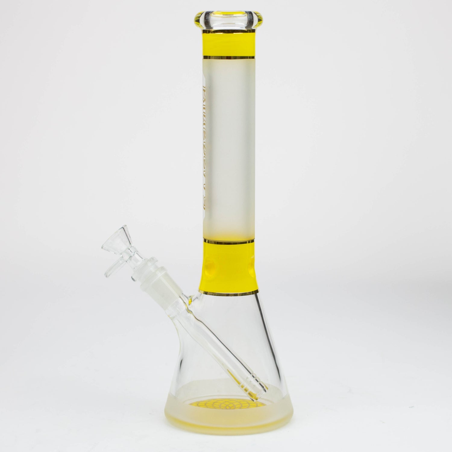 This is a solid beaker with a frosted neck and a mandala pattern on the base in the same colour accent as the ice pinch. It comes with a herb bowl and slitted downstem. This is a mini version of our 18 inch Nice Glass ST016 beaker of the same style.
