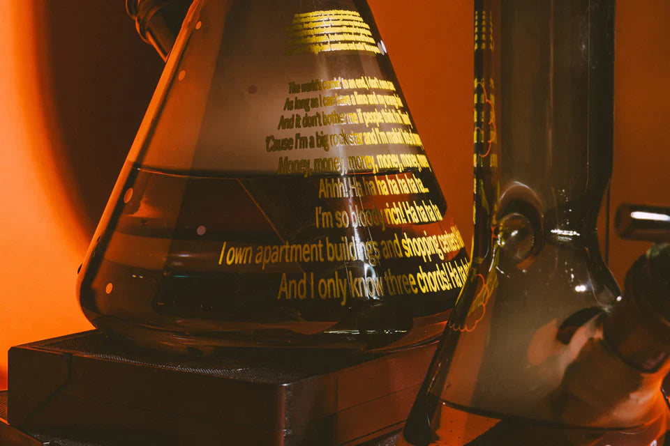 In space, no one can hear you cough… but they’ll definitely see you blaze! The 10” Stoners in Space Beaker Base Water Pipe by Cheech & Chong® Glass takes your session to a whole new galaxy of fun. Featuring Cheech & Chong® signature decals and printed lyrics from “Earache My Eye”, this piece is the ultimate collectible for fans of the legendary duo.