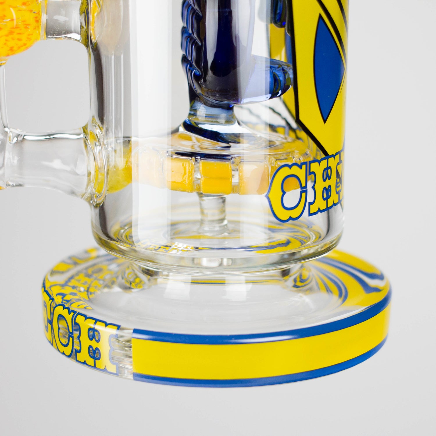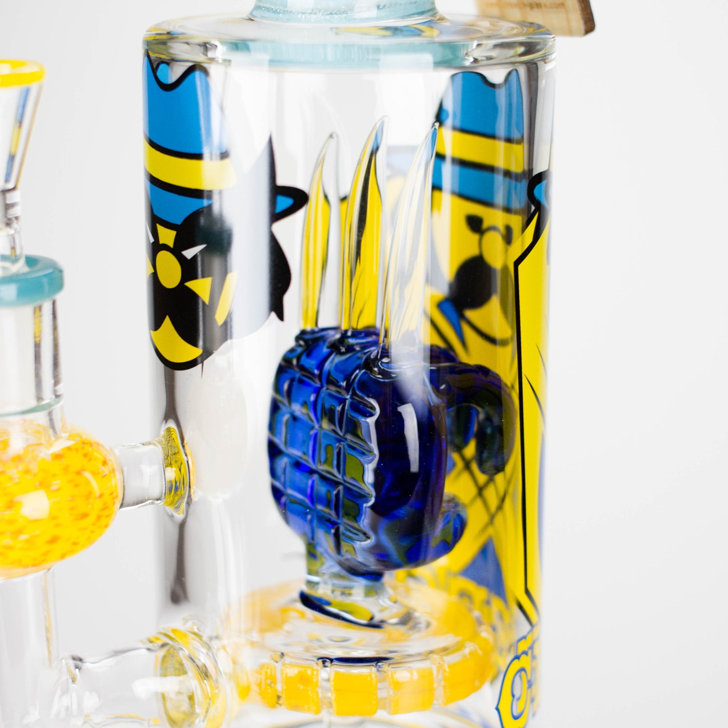 Add explosive style and smooth function to your collection with the 12" Bandito Mask Tube Bong by Cheech Glass. Decked out in bold yellow and blue graphics featuring Cheech’s iconic bandito mask design, this piece packs both visual punch and performance. The star feature? A deep blue grenade-style percolator with clawed diffuser arms that deliver intense smoke diffusion.