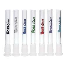 The Hoss Glass 5.5" Full Colour Downstem Diffuser is a replacement downstem designed to enhance your smoking experience. It features an 18mm to 14mm joint configuration, meaning the 18mm end fits into the bong's joint, while the 14mm end accommodates the bowl or slide. The downstem measures 5.5 inches from the top of the joint section to the base of the diffuser.