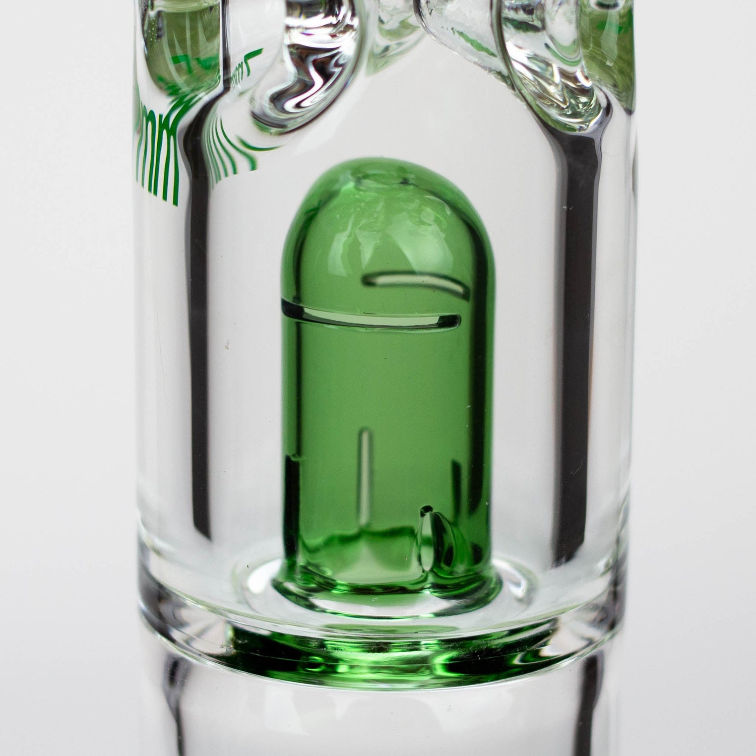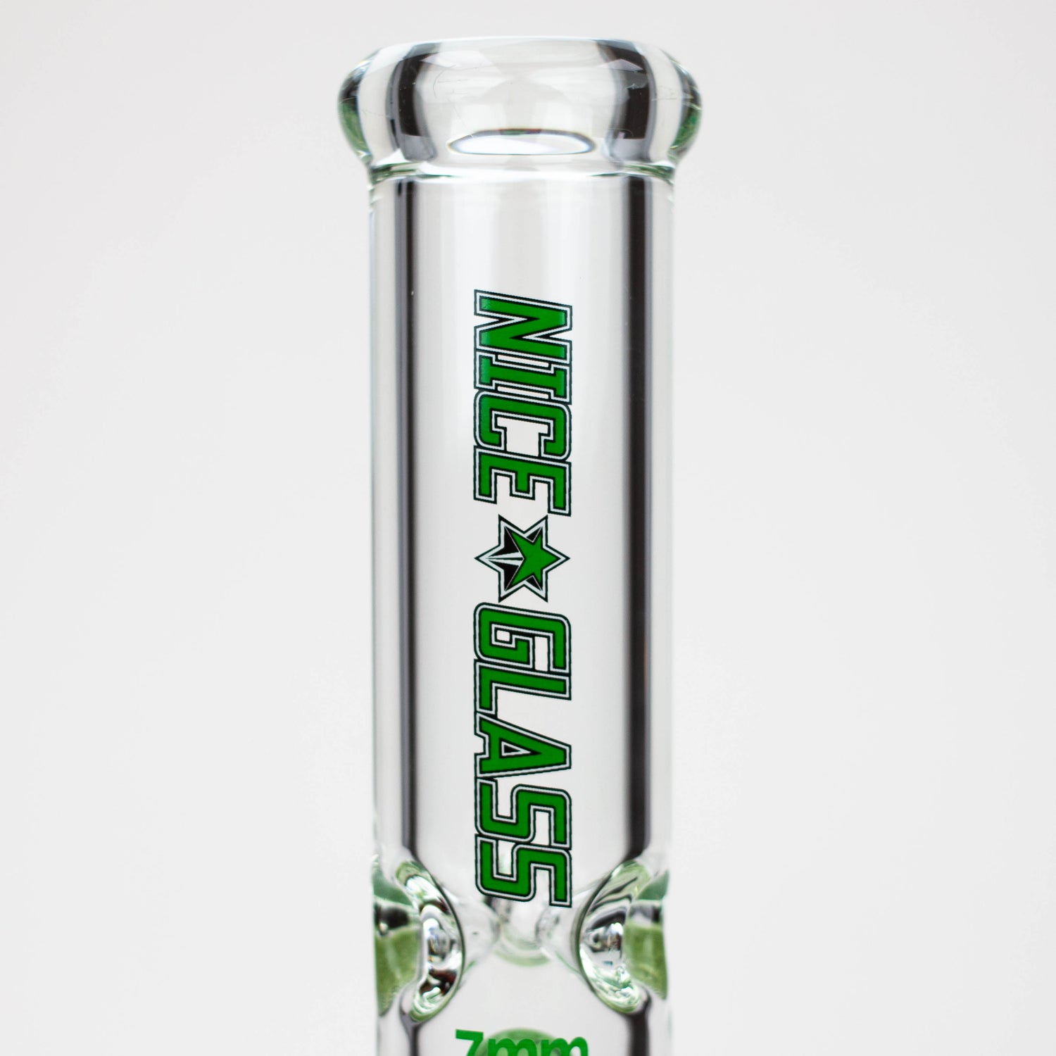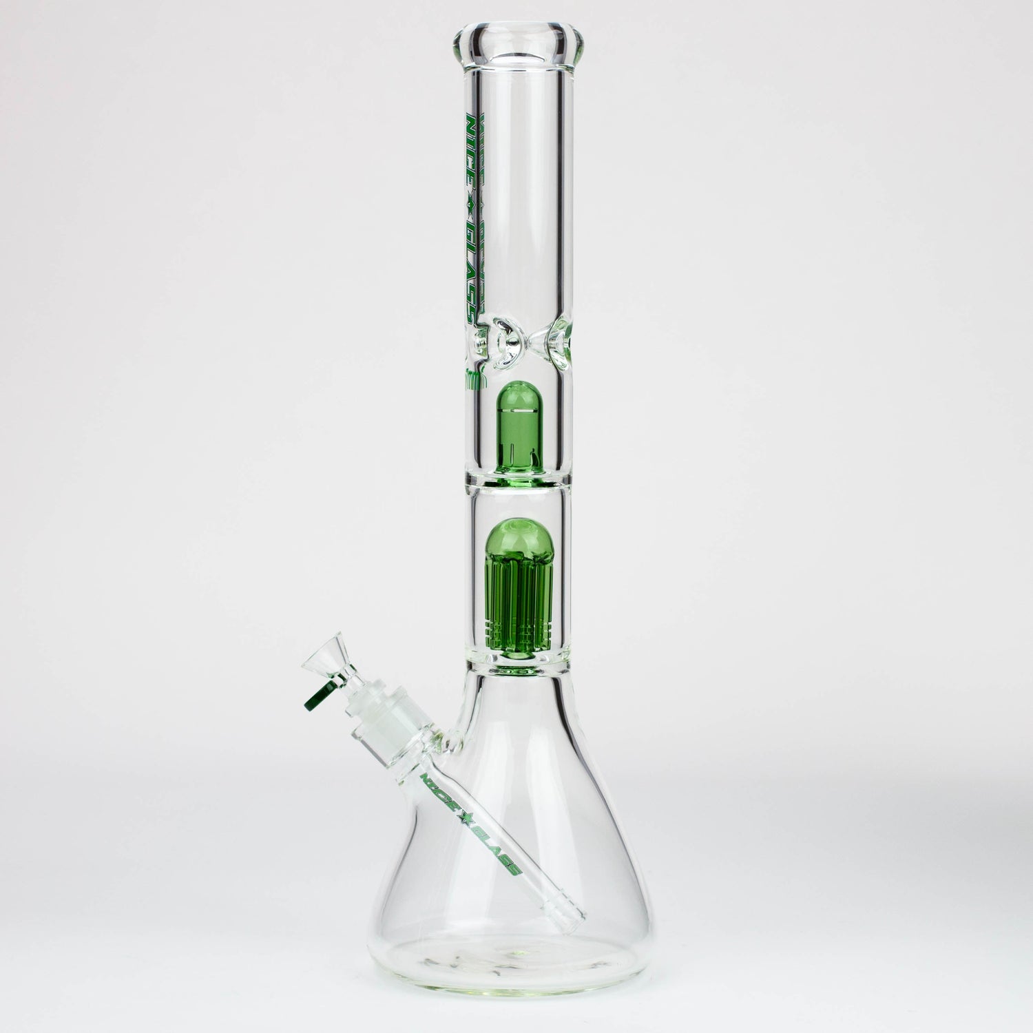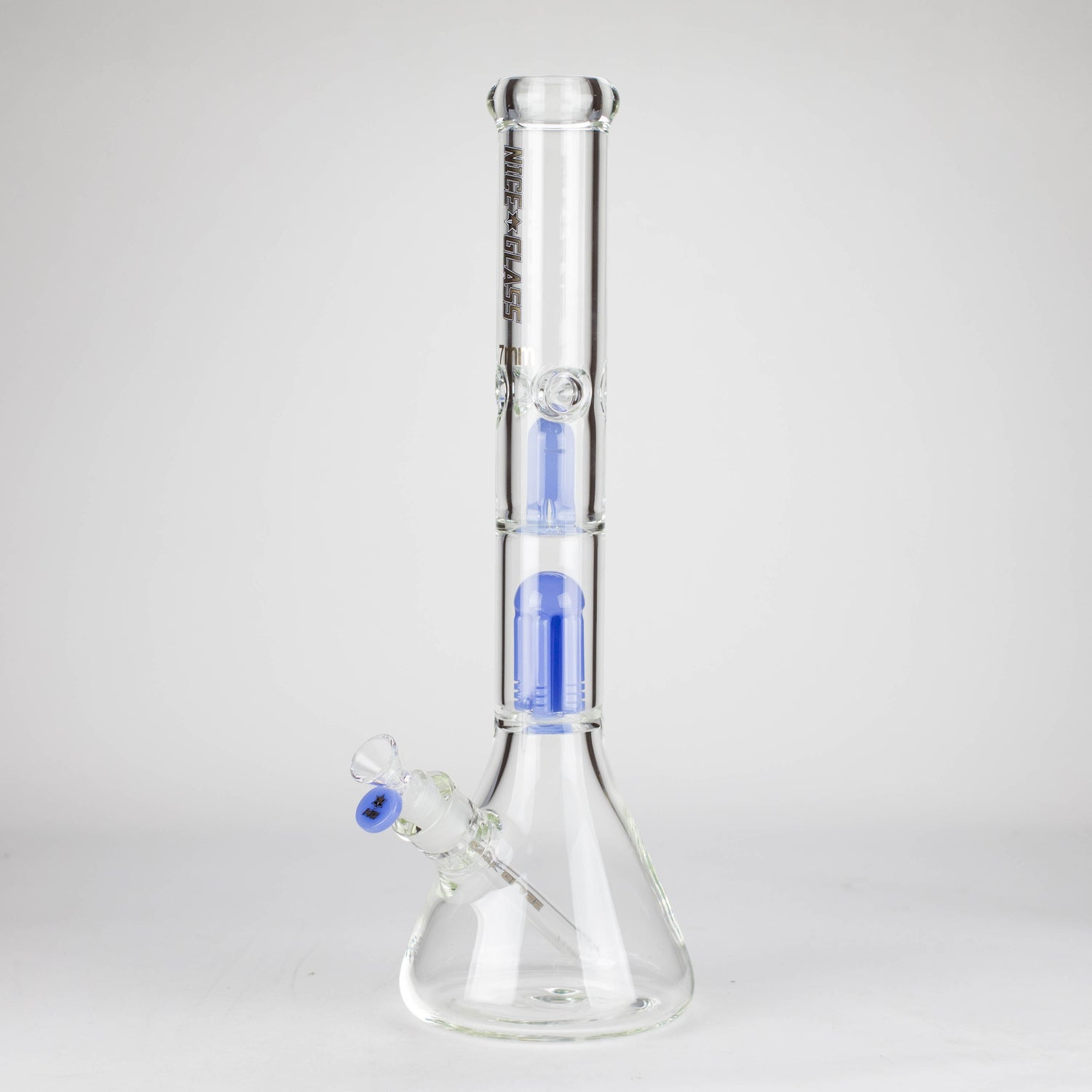 A thick Nice Glass beaker featuring a 6-arm tree percolator in the upper chamber and splash guard. It also comes with ice notches, slitted downstem and herb bowl.