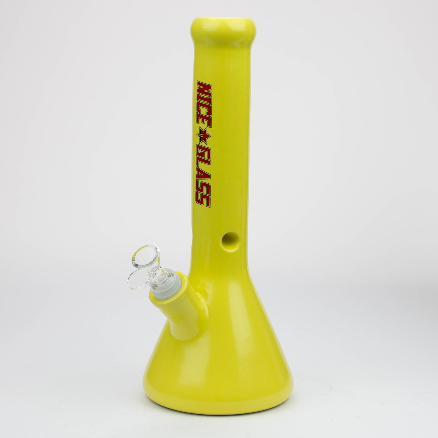 This stylized Nice Glass bong has a flat beaker base that is slightly tapered toward the tube. Ice notches are in coloured borosilicate glass, along with the thick mouthpiece and herb bowl roll stopper. The base features our NG logo in matching colour. If you want a classy long-lasting glass piece, then this one will not disappoint. Available in a range of colours.